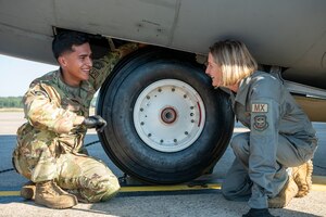 Col. Angela Ochoa, 19th Airlift Wing commander, and Airmen with the 19th Aircraft Maintenance Squadron, change a tire on a C-130J Super Hercules at Little Rock Air Force Base, Arkansas, Sept. 19, 2022. Ochoa embedded with Airmen from the 19th AMXS to gain insight on their day-to-day operations and