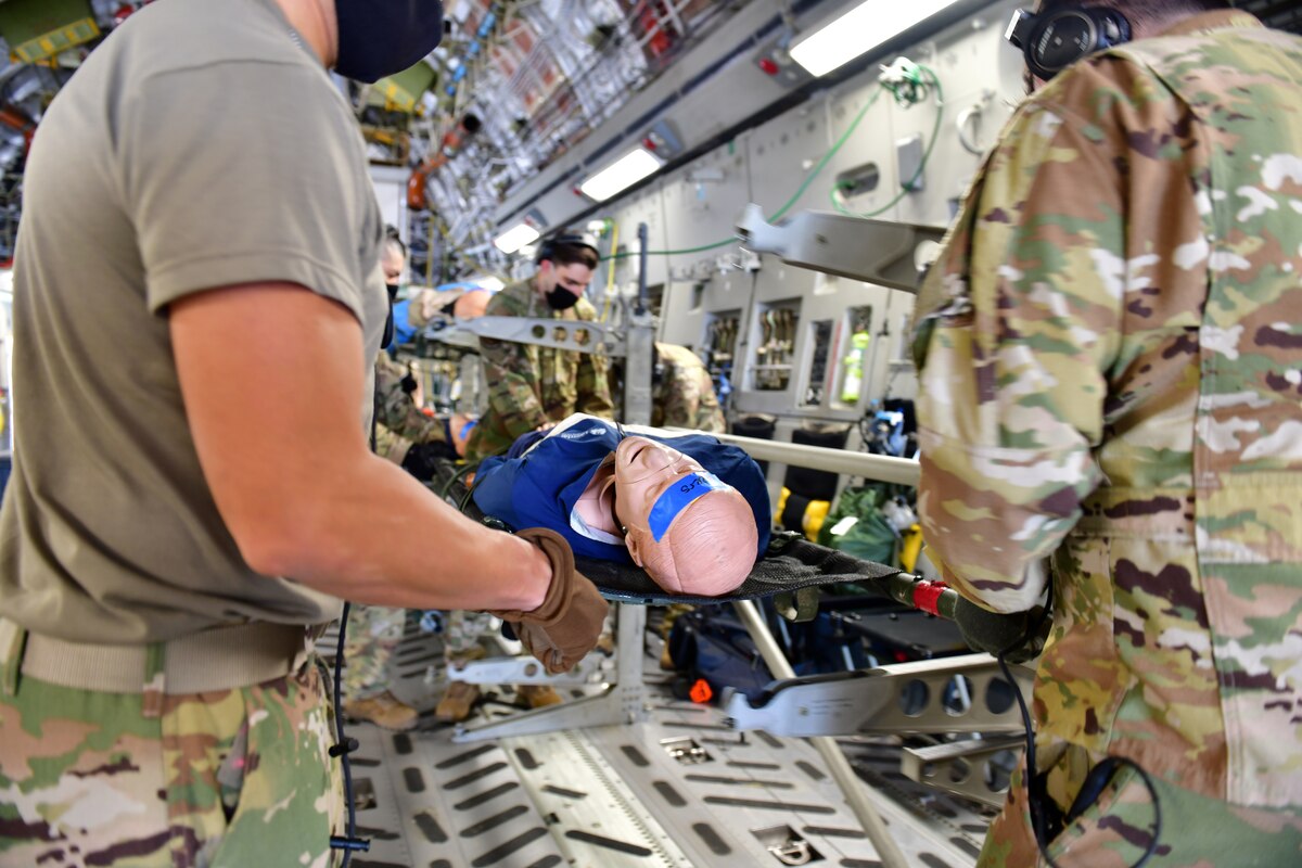 Airmen assigned to the 375th Aeromedical Evacuation Squadron prepare to transload simulated patients onto a C-17 Globemaster III during Green Flag Little Rock 21-05 at Alexandria International Airport, Louisiana, March 10, 2021. GFLR is planned and executed by the 34th Combat Training Squadron, who partners with U.S. Army Brigades, special operations forces, Air Force airlift and contingency response units, and international partners for training simulations staged out of Little Rock Air Force Base, Arkansas, Alexandria, and Fort Polk, Louisiana. (U.S. Air Force photo by Staff Sgt. Jeremy McGuffin)
