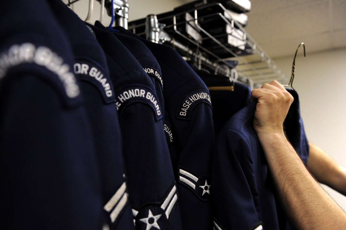 Senior Airman Jonathan Owen, a Base Honor Guard ceremonial guardsman, removes an aiguillette from a ceremonial jacket May 28, 2013, at Little Rock Air Force Base, Ark. One of Owen's additional duties while in the honor guard is ensuring that the ceremonial uniforms are serviceable and meet dress and appearance standards. (U.S. Air Force photo by Senior Airman Rusty Frank)