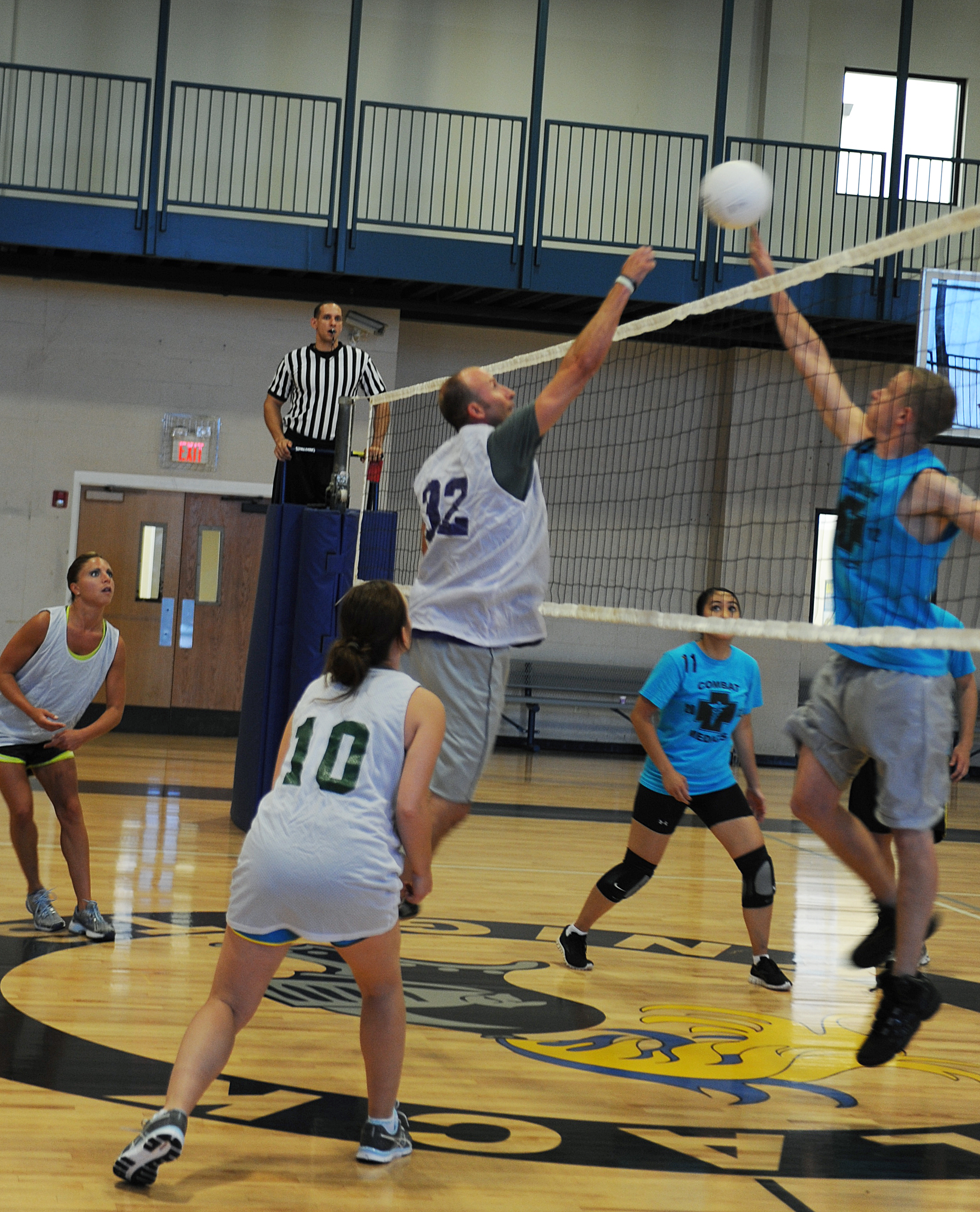 Members of the 189th Airlift Wing volleyball team prepare to block a spike Tuesday, at Little Rock Air Force Base, Ark., during a playoff volleyball game against the 19th Medical Group. The 19th MDG loss the first game 25-19, but won the final two 25-20 and 15-14. (U.S. Air Force photo by Airman 1st Class Ellora Remington)