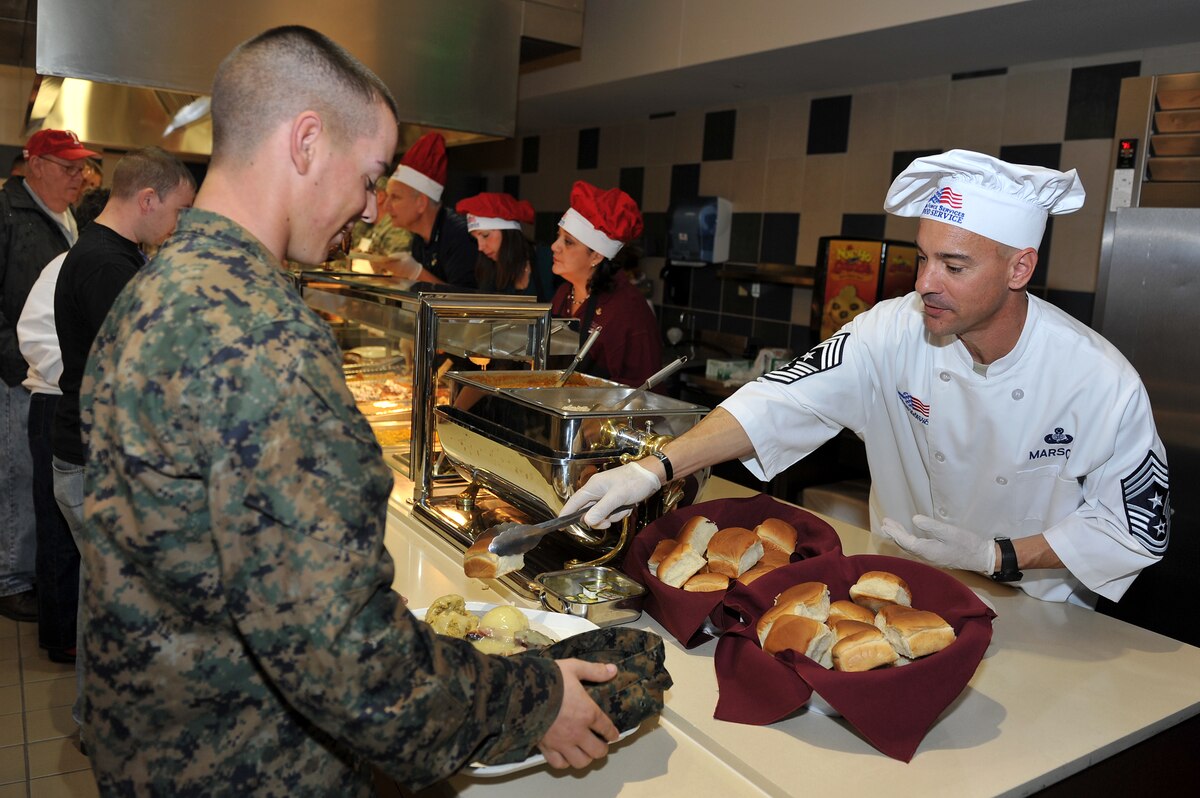 Maj. Justin Barry, 314th Airlift Maintenance Squadron commander, serves a stacked plate to Airman 1st Class Andrew Erwin, 314th Airlift Maintenance Squadron crew chief, Nov. 25, 2010, at the Hercules Dining Facility at Little Rock Air Force Base, Ark. Several base leaders and their families worked the Thanksgiving meal as servers during the holiday event. (U.S. Air Force photo by Staff Sgt. Chris Willis)