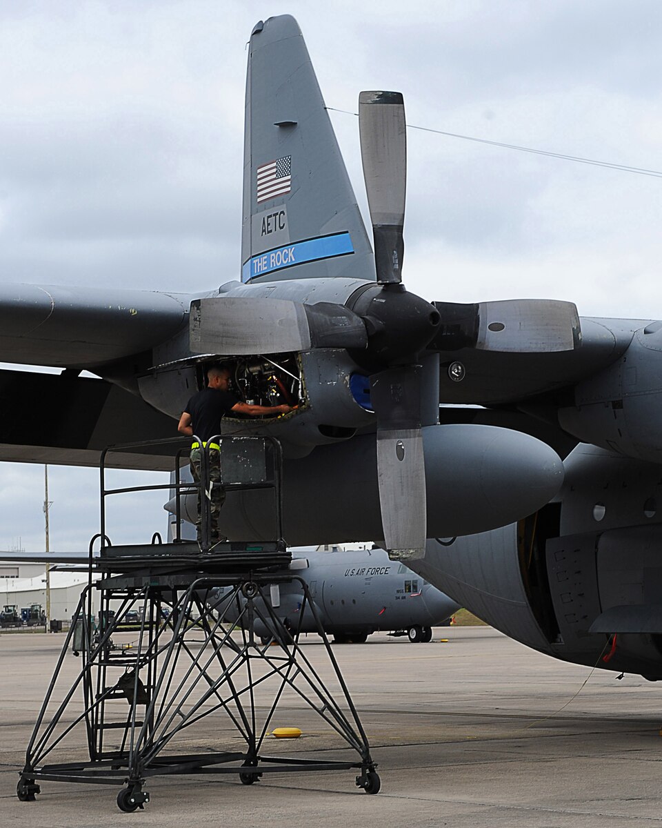 Senior Airman Frank Santiago, a 314th Aircraft Maintenance Squadron crew chief, reviews inspection work cards needed to properly perform the basic post flight/preflight inspection of a C-130 Oct. 26.  The basic post flight/preflight inspection is a combination inspection that lets the crew chiefs inspect and perform a more detailed inspection of the aircraft.  (U.S. Air Force photo by Staff Sgt. Chad Chisholm)