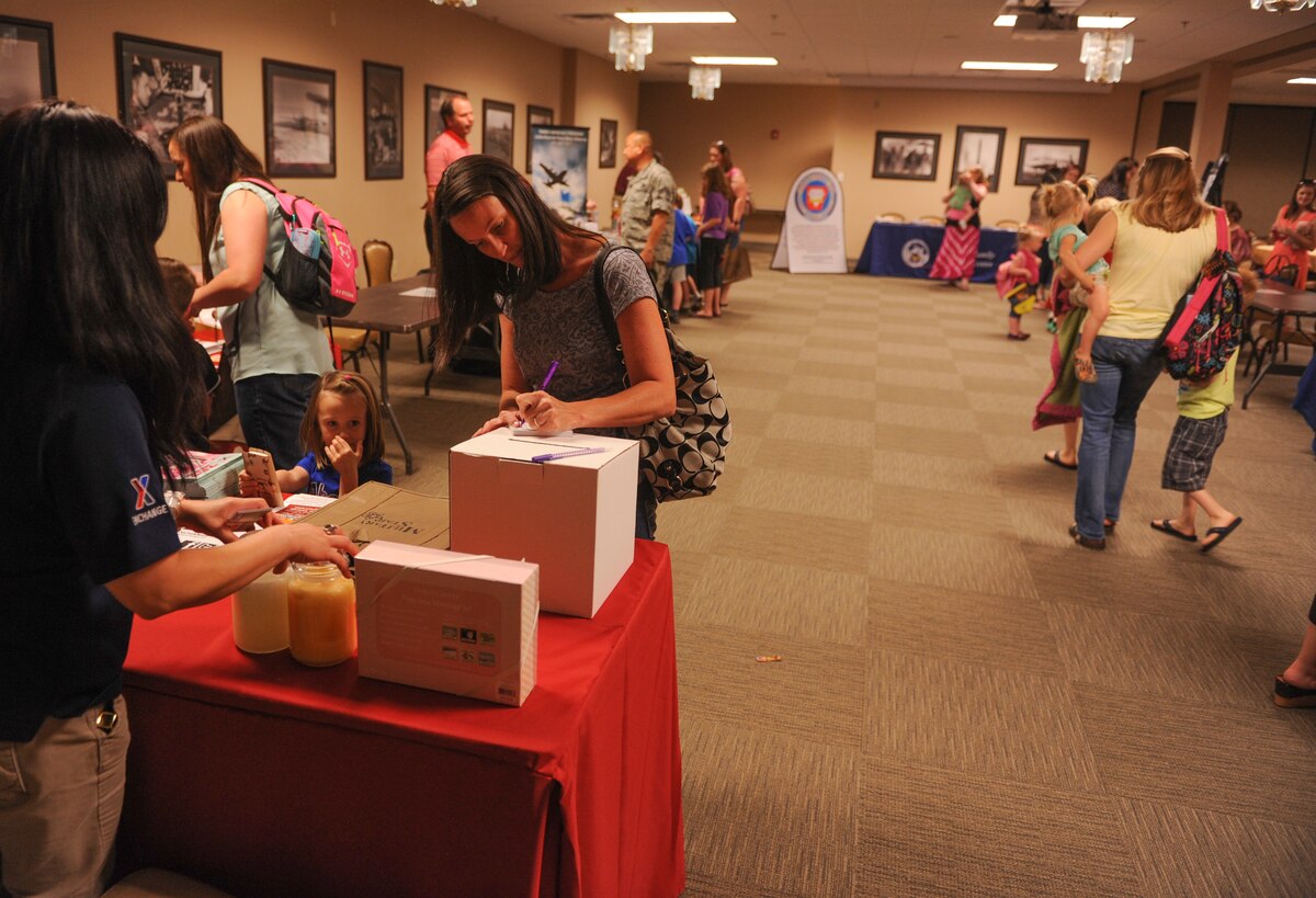 Children dance to the music of Pam Mendez, a clown, entertainer and ventriloquist, May 5, 2015, at Little Rock Air Force Base, Ark. The quarterly dinner gives families of deployed Airmen a chance to get together for a free meal and to receive information and assistance while separated from their loved ones. (U.S. Air Force photo by Senior Airman Scott Poe))