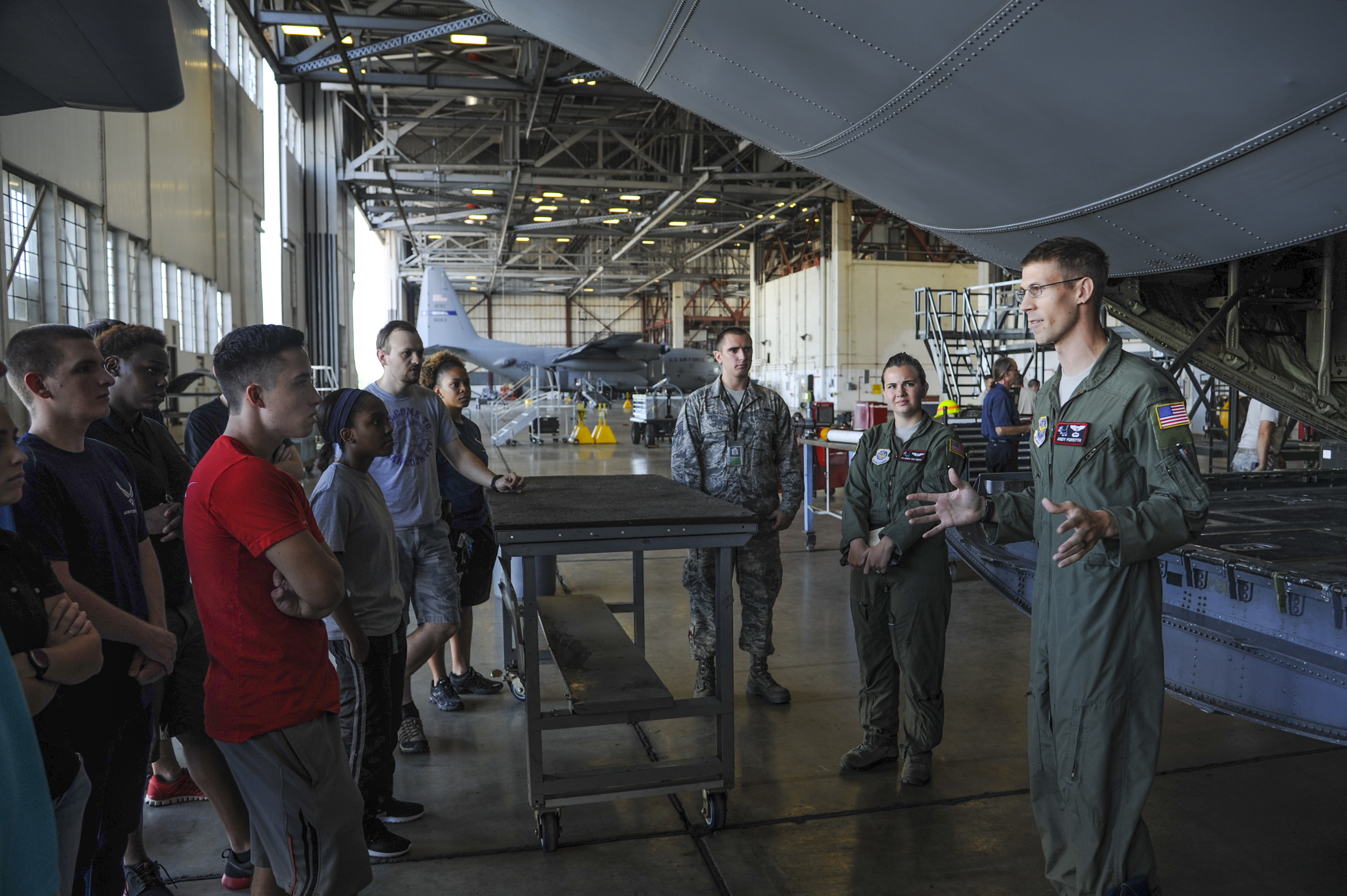 Airman 1st Class Jacob Martinez, a 19th Civil Engineer Squadron explosive ordnance disposal technician, showcases a remote-controlled robotic device used to diffuse explosives Aug. 21, 2014, at Little Rock Air Force Base, Ark. Martinez explained to the Air Force recruits what the job of an EOD technician entails. (U.S. Air Force photo by Airman 1st Class Harry Brexel)