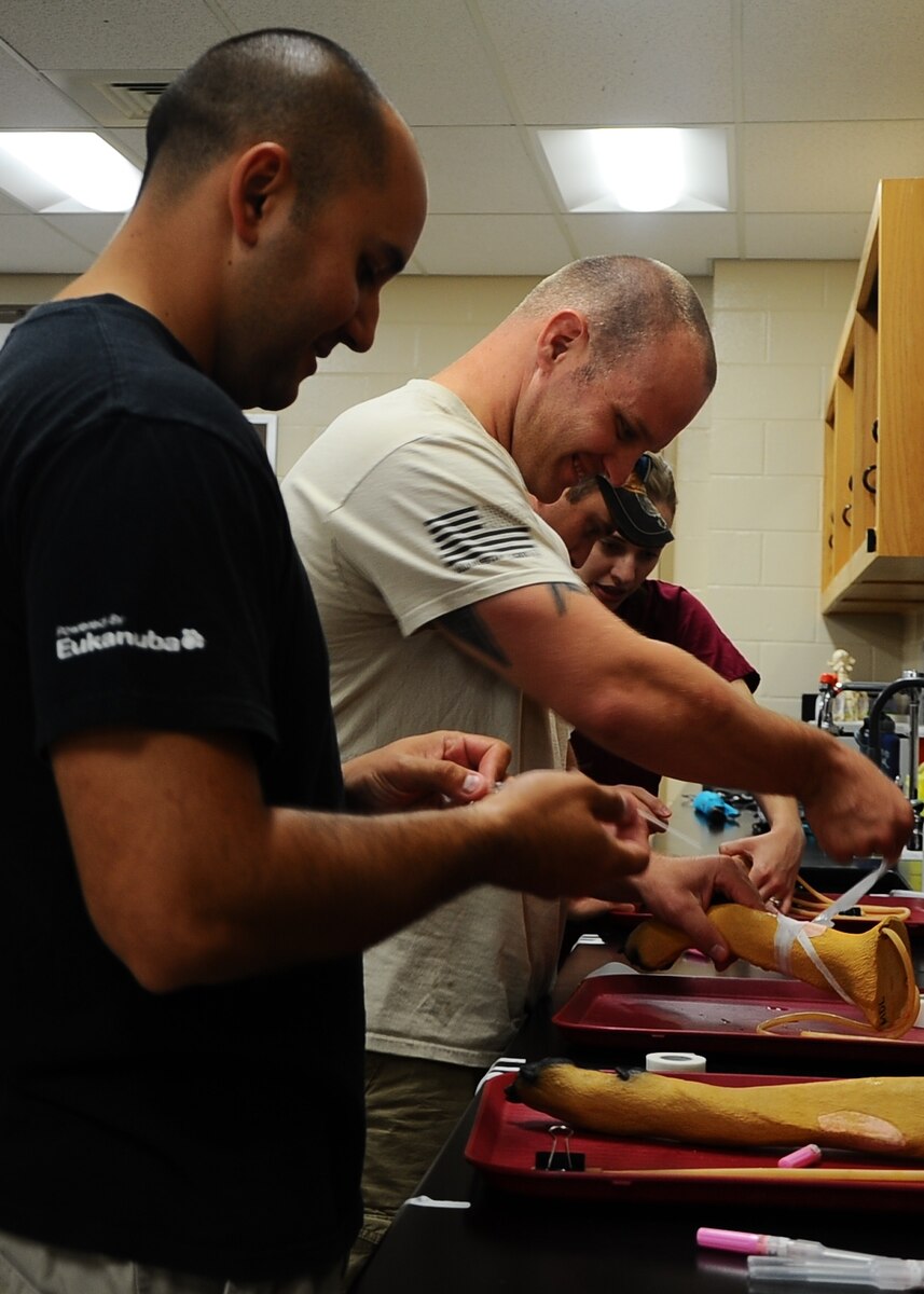 Staff Sgt. David MacDonald, 19th Security Forces Squadron military working hog handler, works alongside other military working dog handlers from various bases in a veterinary training event held Aug. 23 at the Mississippi State University College of Veterinary Medicine, Starkville, Miss. The training focused on teaching the handlers skills such as CPR, how to bandage injuries, and wound care. (U.S. Air Force photo by Senior Airman Stephanie Englar)