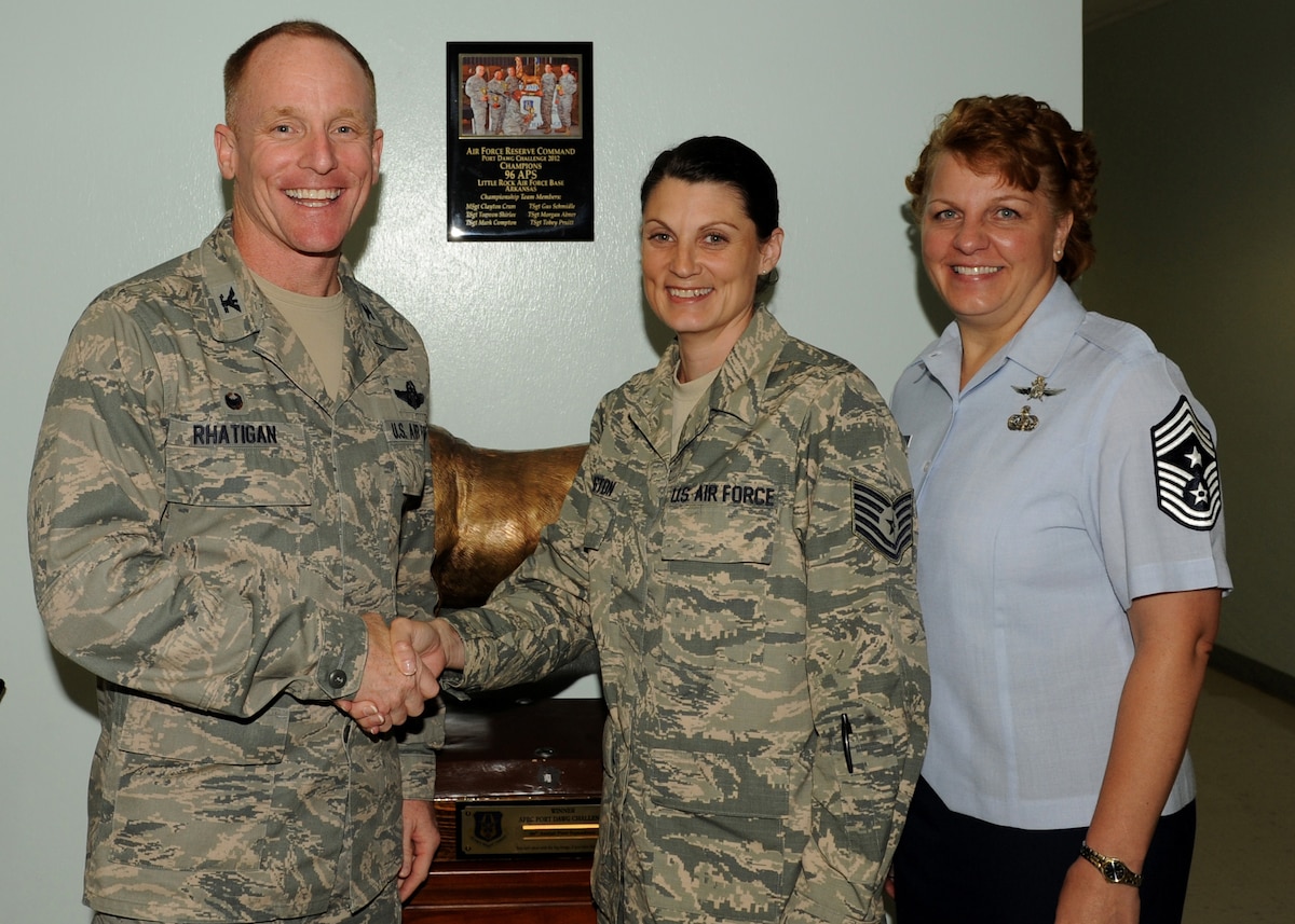 Col. Patrick Rhatigan, 19th Airlift Wing commander, and Chief Master Sgt. Rhonda Buening, 19th Airlift Wing command chief, congratulate Tech. Sgt. Jacqueline Langston, a 96 Aerial Port Squadron unit training, education and deployment manager, Aug. 11, 2014, at Little Rock Air Force Base, Ark. Langston prepared 32 members for air expeditionary force deployments as the unit deployment manager. (U.S. Air Force photo by Airman 1st Class Scott Poe)