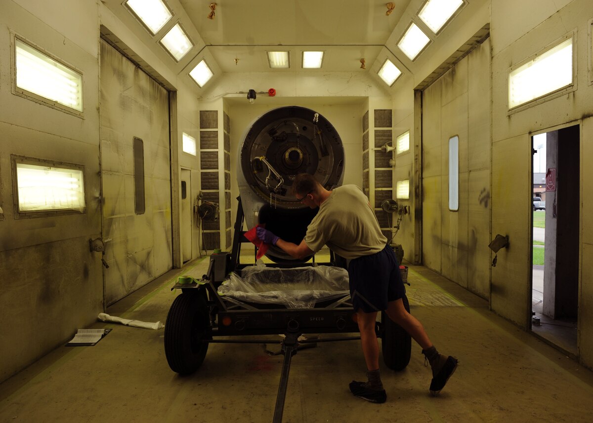 Airman 1st Class Jacob Chastain, a 19th Maintenance Squadron structural maintenance journeyman, prepares an area for sanding, primer and then paint July 17, 2014, at Little Rock Air Force Base, Ark. Multiple procedures go into preparing materials for paint including masking, stripping the old paint, sanding and wiping down the material before the primer is applied. (U.S. Air Force photo by Airman 1st Class Scott Poe)