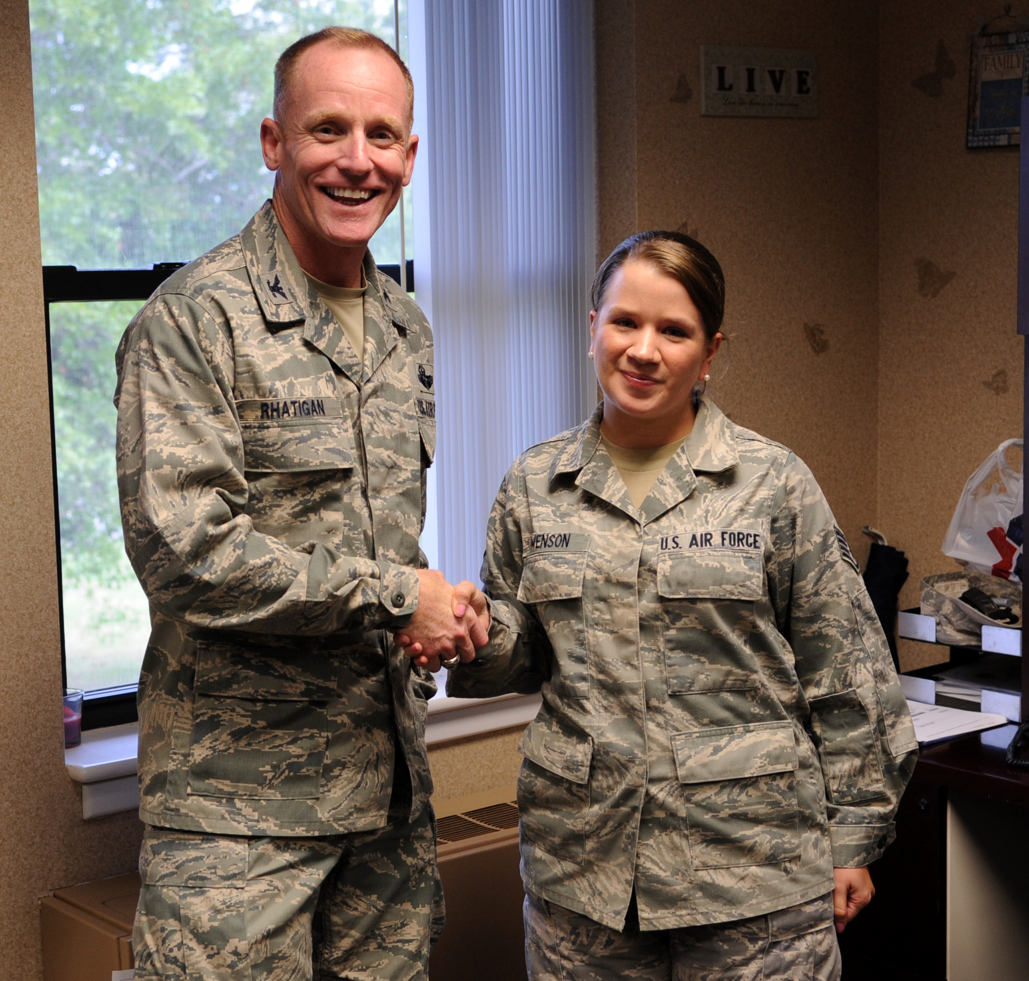 Staff Sgt. Kaelah Swenson, a 19th Operations Group knowledge operations manager, inputs data to assist a customer with a trouble ticket request. Col. Patrick Rhatigan, 19th Airlift Wing commander, congratulates Swenson for her selection as Combat Airlifter of the Week on Oct. 21, 2013, at Little Rock Air Force Base. Swenson, a native of Spencer, Mass., was recognized for creating an access control tracker to oversee 1,800 users within the 19 OG. (U.S. Air Force photo by Airman 1st Class Harry Brexel)