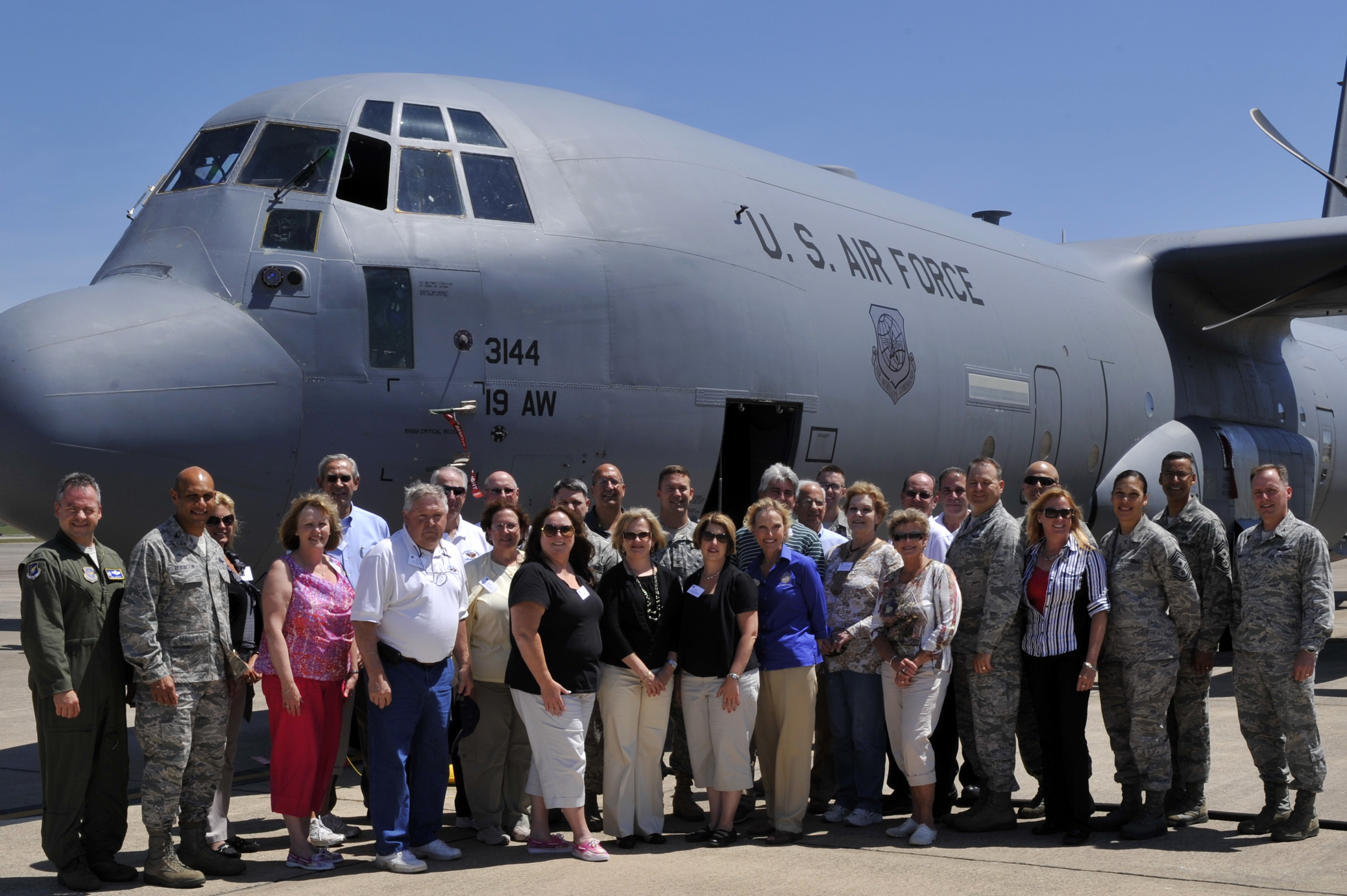 Col. Brian Robinson, 19th Airlift Wing commander, and Team Little Rock leadership pose for a photo with senior leadership, honorary commanders, and civic leaders from Joint Base McGuire-Dix-Lakehurst N.J., on the flight line June 14, 2012, at Little Rock Air Force Base, Ark. Senior leadership, honorary commanders, and civic leaders from Joint Base McGuire-Dix-Lakehurst toured the assets of Little Rock Air Force Base including the 714th TRS “Center of Excellence,” training facility. (U.S. Air Force photo by Airman 1st Class Rusty Frank)