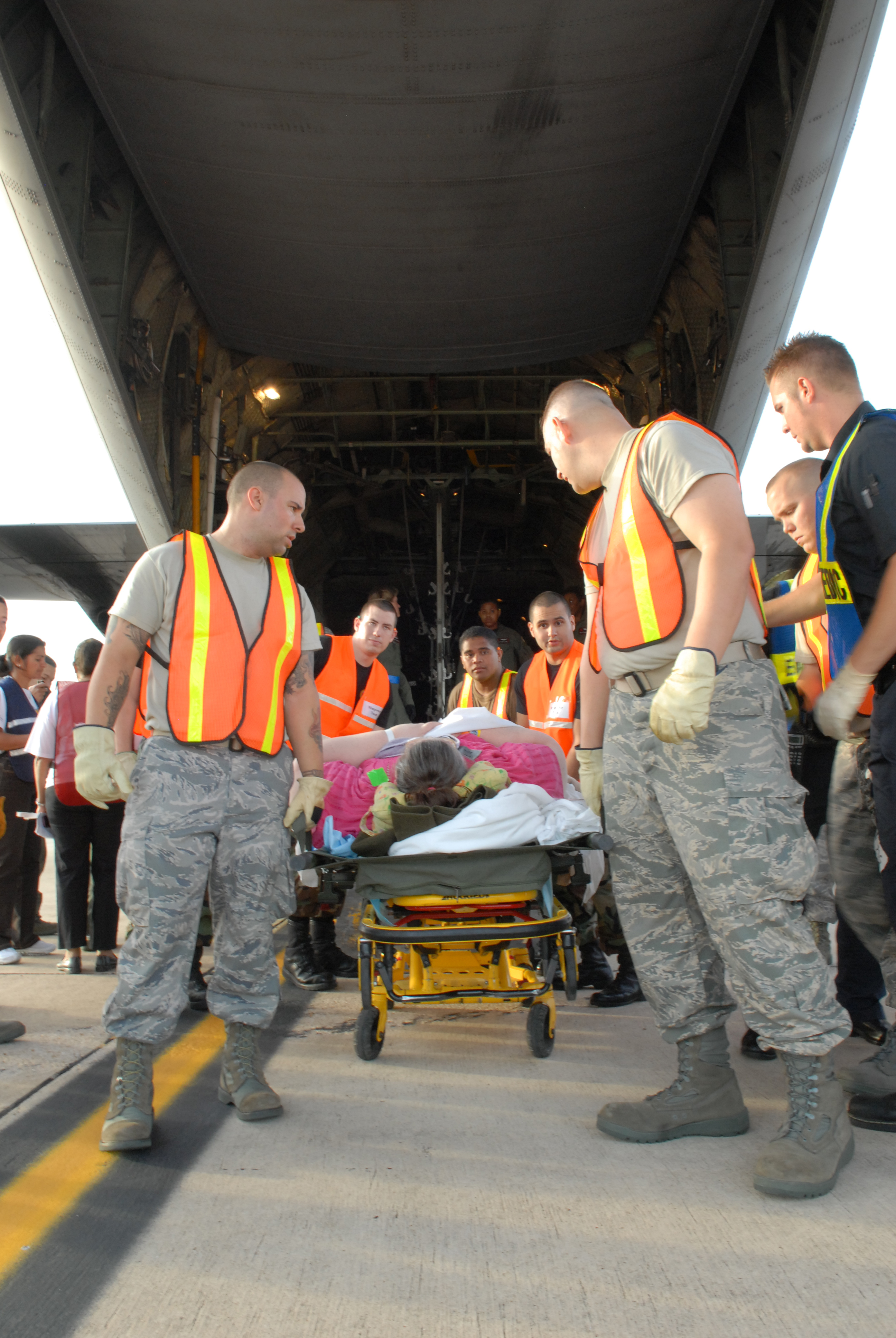 LACKLAND AIR FORCE BASE, Texas -- U.S. Air Force Airmen from the 37th and 59th Air Wing unload hospital patients that were evacuated from Beaumont, Texas, September 12, 2008. These patients were transported by a combined effort from the Little Rock Air Force Base C-130 aircraft and crews and the 908th Aero medical Evacuation Squadron, Scott Air Force Base, IL in preparation for Hurricane Ike's landfall in southern Texas. (U.S. Air Force photo by Staff Sgt. Chris Willis) (RELEASED)