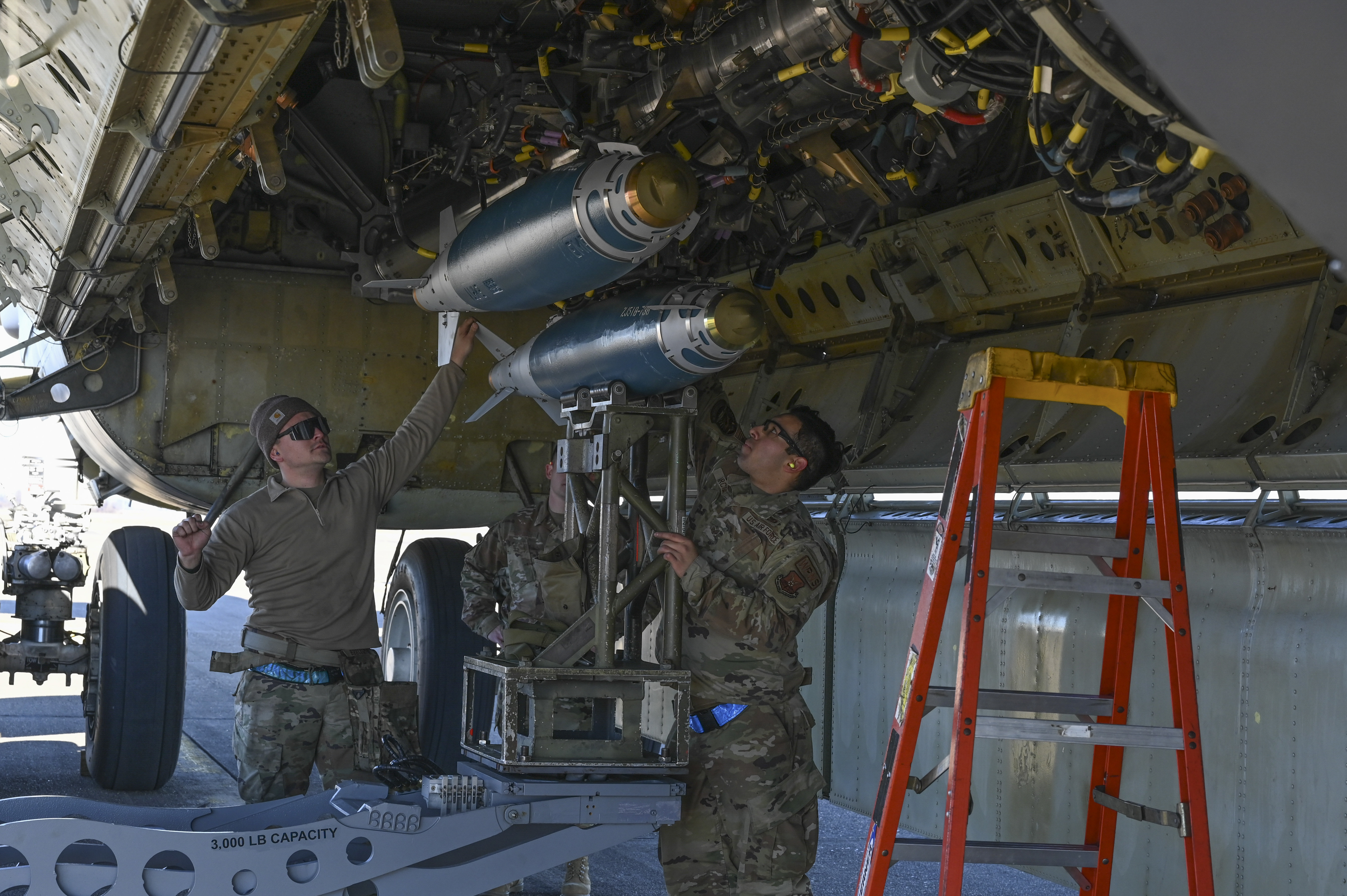 U.S. Air Force Senior Airman Jake Wagner, left, and Staff Sgt. Luis Garcia, right, 2nd Aircraft Maintenance Squadron weapons load crew members, load a munition onto a B-52 Stratofortress at the Arkansas International Airport, Arkansas, during Green Flag Little Rock 22-03, Jan. 11, 2022. The munitions were then unloaded from the C-130 and rapidly rearmed on to the B-52s, demonstrating Air Force Global Strike Command's capability to provide long-range deterrence from remote airfields, threatening adversary's key assets and minimizing risk to Air Force personnel. (U.S. Air Force photo by Staff Sgt. Valerie Halbert)