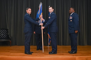 The family of U.S. Air Force Lt. Col. John Fugate, 19th Operations Support Squadron incoming commander, is given a bouquet of roses during the 19th OSS change of command ceremony at Little Rock Air Force Base, Arkansas, Jan. 29, 2026. The flowers served as a way to formally welcome the family of the
